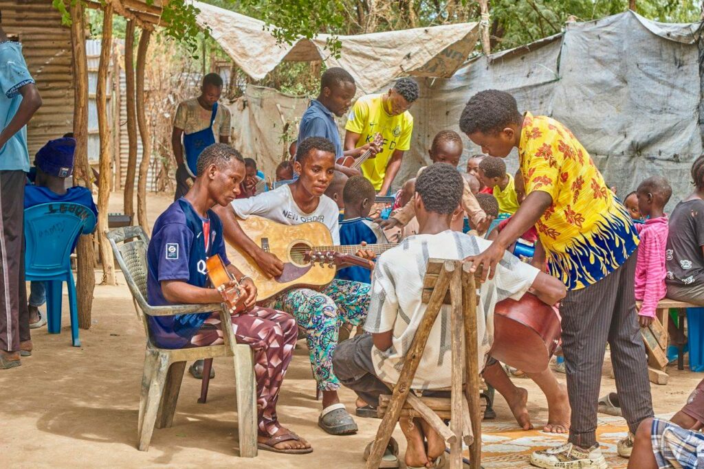One of those young leaders is Samuel Asongo, a musician who grew up in Kakuma. Over the past few years, Samuel has been building something extraordinary: a small but growing music education program inside the camp. With only a handful of instruments and endless determination, he has been teaching children and adults how to play, sing, and create together.